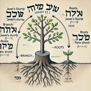 DALL·E 2025-01-23 16.01.30 – A diagram illustrating Isaiah 11_1 in Hebrew. The diagram should depict a tree with labeled parts_ ‘Jesse’s stump’ (גֵּזַע יִשָׁי) at the base, a ‘bra